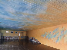 Nach dem Verfugen der Mosaikflächen wurden auch Decke und Wände der Pausenhalle farbdynamisch gestaltet. Hierfür wurden diverse Farbtöne lasierend ineinander gearbeitet. Zum Schluss wird auch die Reliefwand von den Schülern farblich verfeinert. Freude und Stolz begleiteten die finalen Arbeiten.