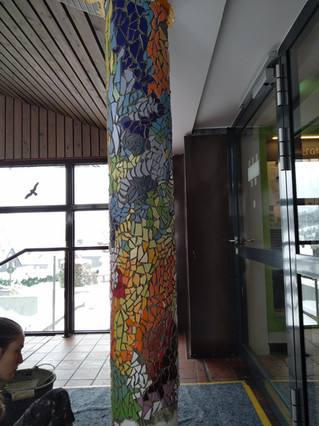 An insgesamt vier Aktionstagen von Dezember bis Ende Januar entstanden in gemeinsamen Workshops mit wechselnder Besetzung mosaizistische Umsetzungen markanter Gestaltungsideen, die ab sofort das Gebäude des Weiterbildungskollegs prägen.