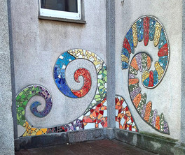 Die Giebelwand sollte eine besondere, ganzheitliche Farb- und Mosaikgestaltung erhalten, die sich am Logo der Schule orientiert. Da sie direkt auf den Schulhof zeigt, belebt das Ergebnis die ganze Schulgemeinschaft.
