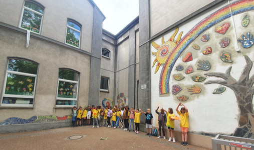 Die Concordia Grundschule und auch das Familiengrundschulzentrum befindet sich in einem Mix aus verschiedenen Schulgebäuden, die ursprünglich alle etwas trist und grau wirken und so gar nicht dem Wesen der Kinder entsprechen. Und so wurde die Idee geboren, mit Hilfe des erfahrenen Künstlers und Pädagogen Robert Kaller nicht nur den sozialen Konflikt zu lösen sondern auch gleichzeitig das Gebäude zu verschönern.