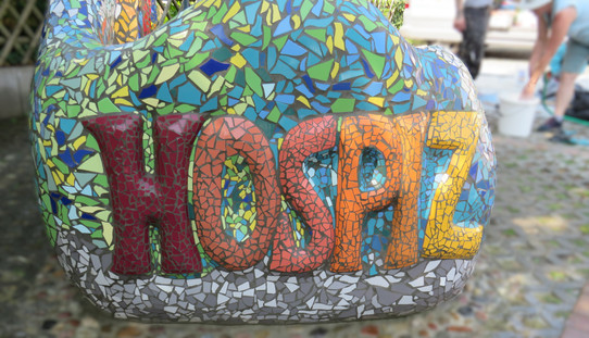 Die Gäste des Hospizes, Besucher und Nachbarn sitzen nun auf diesen außergewöhnlichen Kunstwerken - einem sozialkünstlerischen Teil des dortigen schicksalhaften Geschehens.